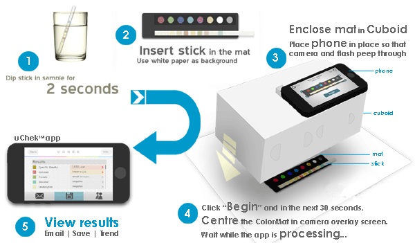Камера смартфона захватывает флуоресцентное свечение. Затем андроид-приложение обрабатывает изображение и передает информацию в соответствующие базы данных или пункты медицинской помощи для измерения концентрации альбумина в моче. Весь тест занимает около пяти минут.